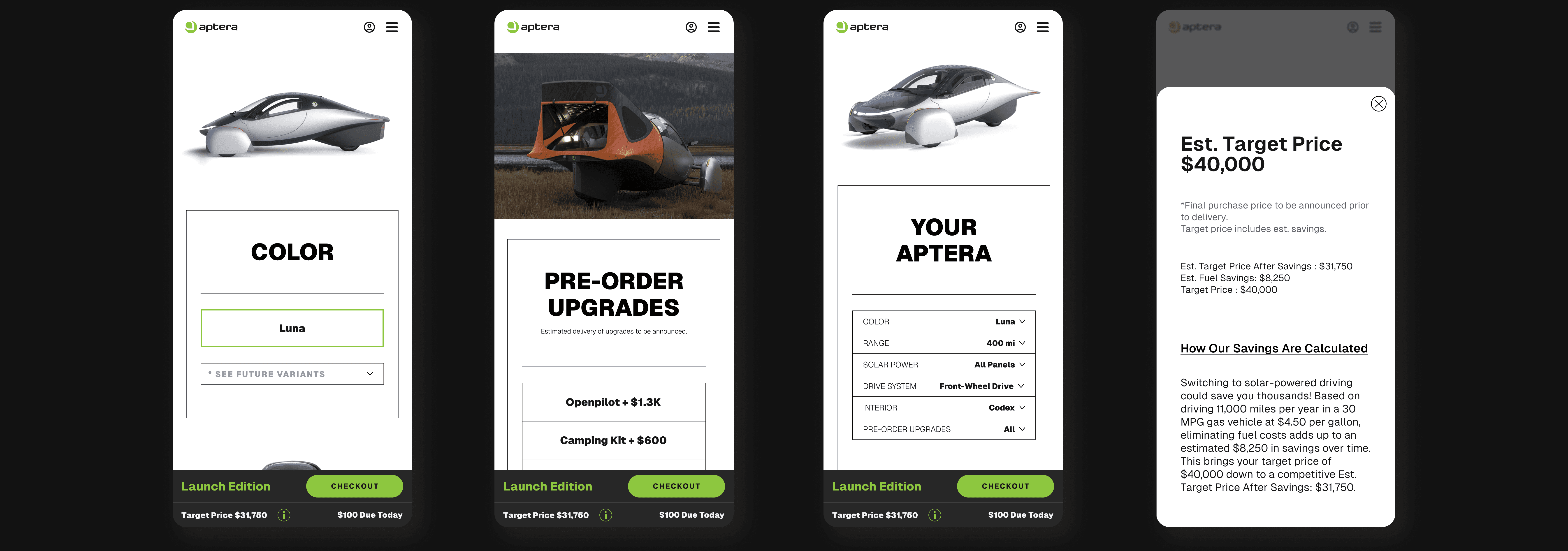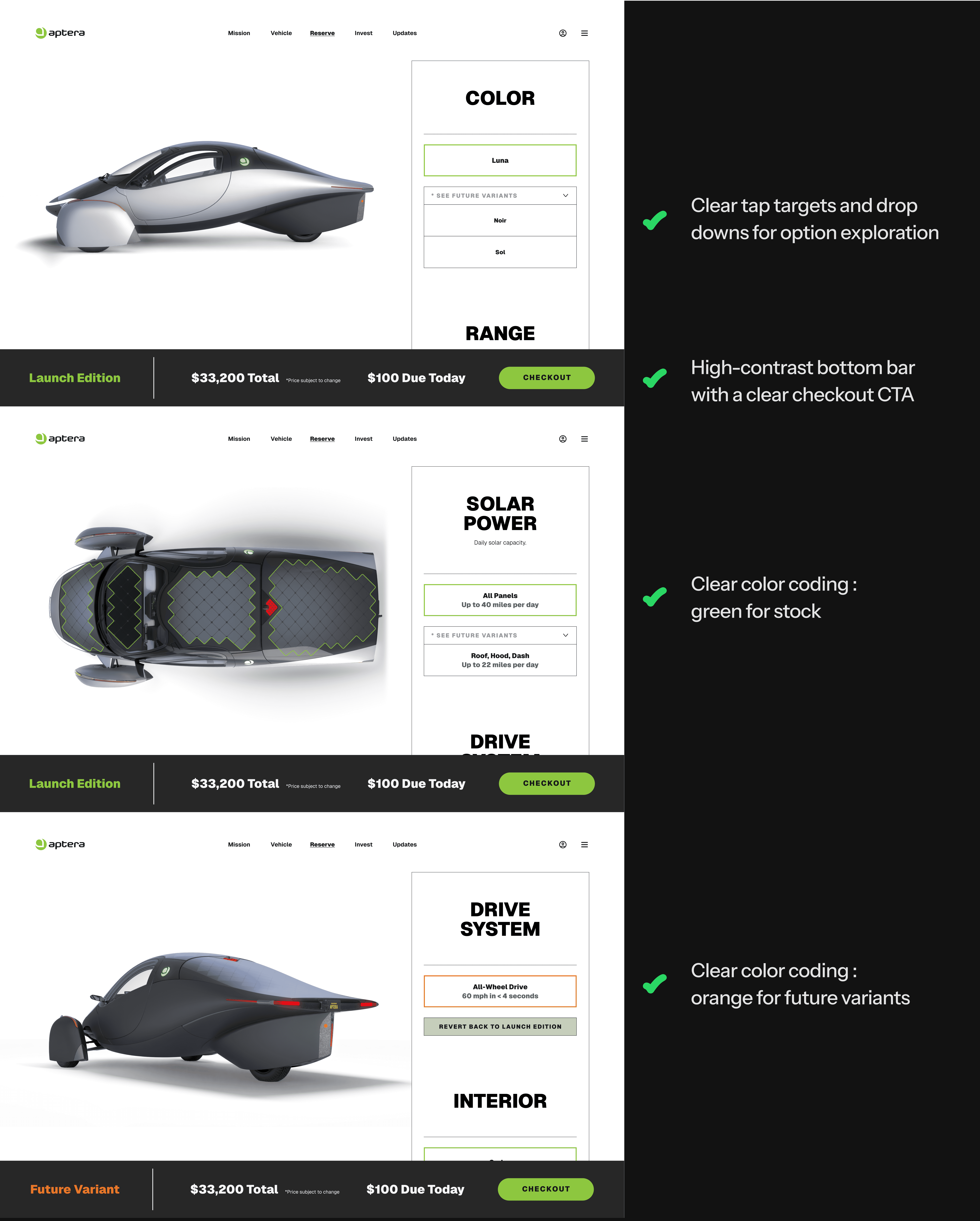 We evolved the design into a simpler, more scalable system guided by clear color-coded tap targets. Green signalized options within the Launch Edition specs, while orange indicated future variants. This was mirrored in the bottom bar for clarity when checking out.