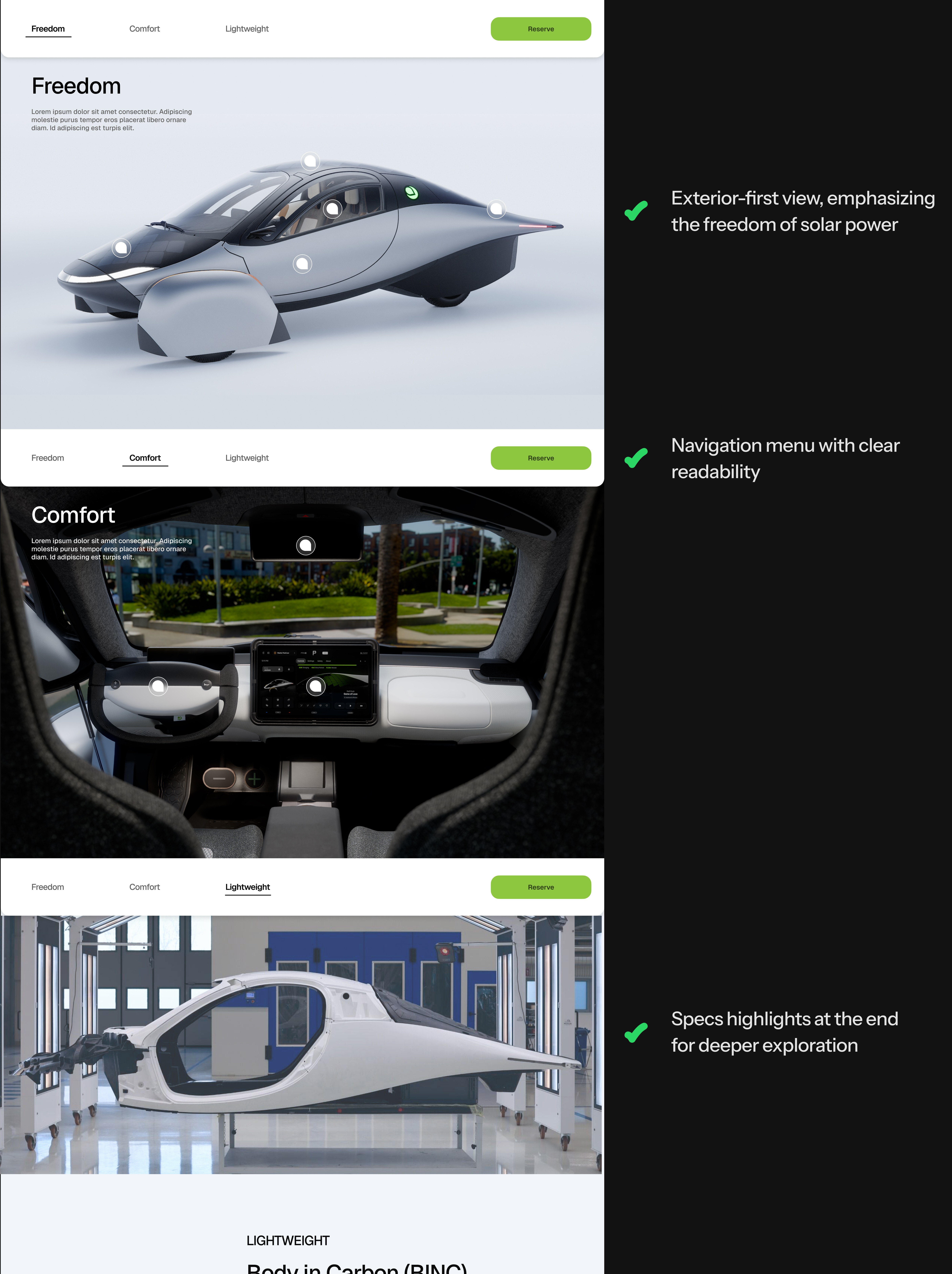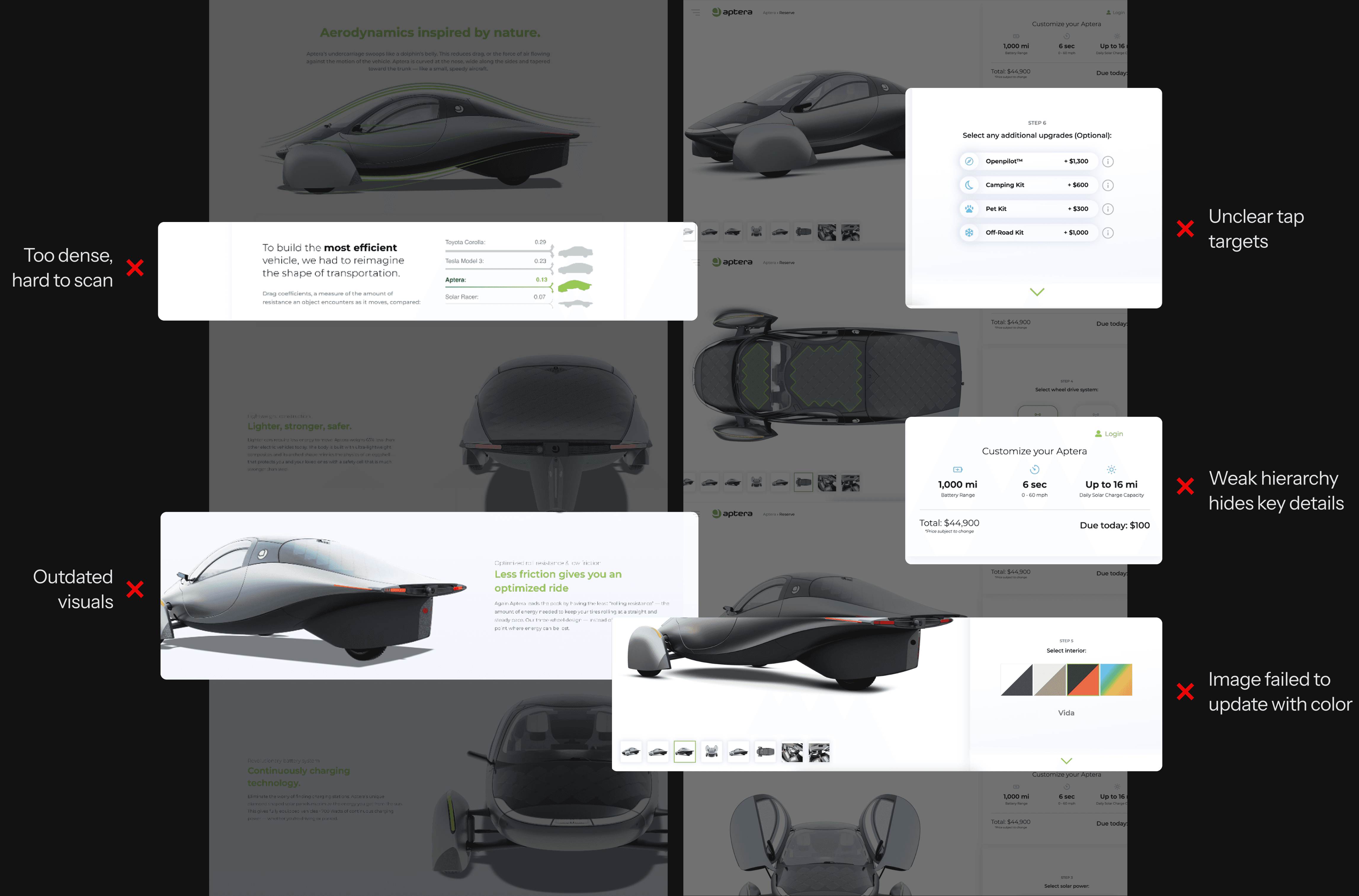 We benchmarked product websites to uncover effective patterns in flow and storytelling. High-converting sites surfaced value, pricing and trust near the reservation CTA, while Aptera's older flow buried key details and added friction.