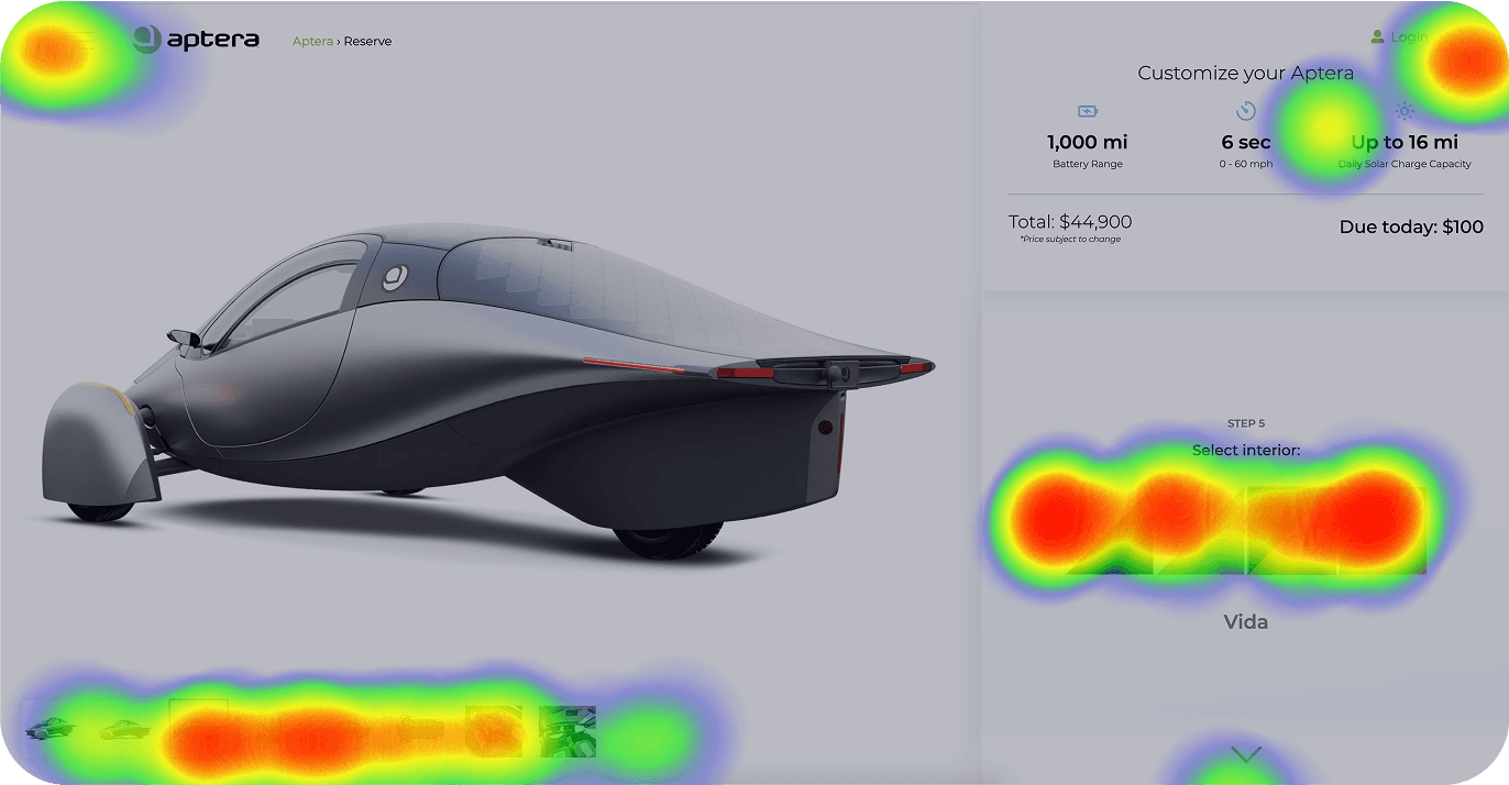 We began by mapping key exit points to understand user drop-off patterns. While users engaged heavily with product visuals and specs, heatmaps revealed high bounce rates—most notably on the vehicle page and at step two of interior selection.