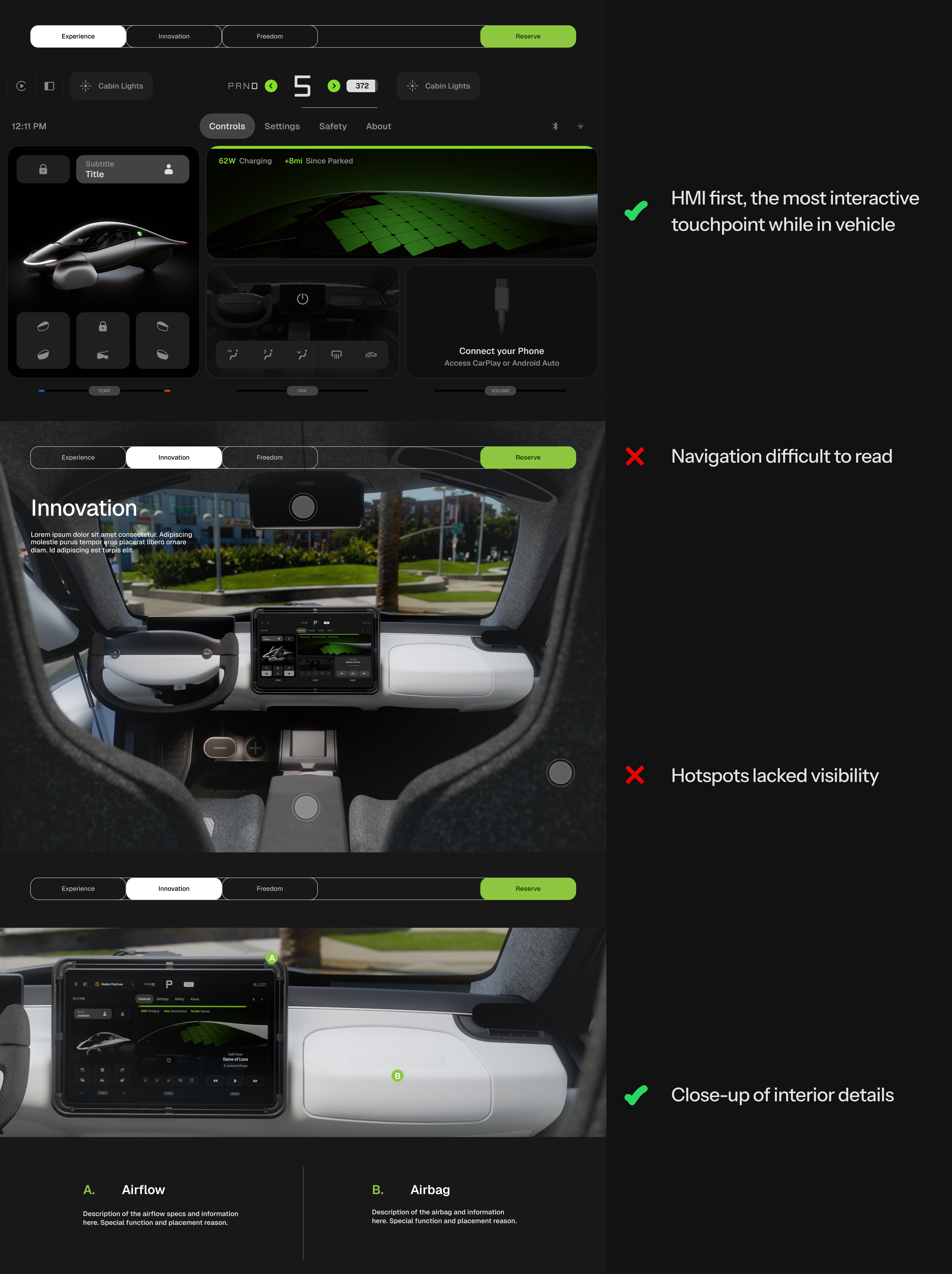 Flow 1 focuses on the experience from the interior of the vehicle to the exterior. This inside-out approach begins with the driver’s interaction in the in-vehicle interface and expands outward to highlight the full experience.