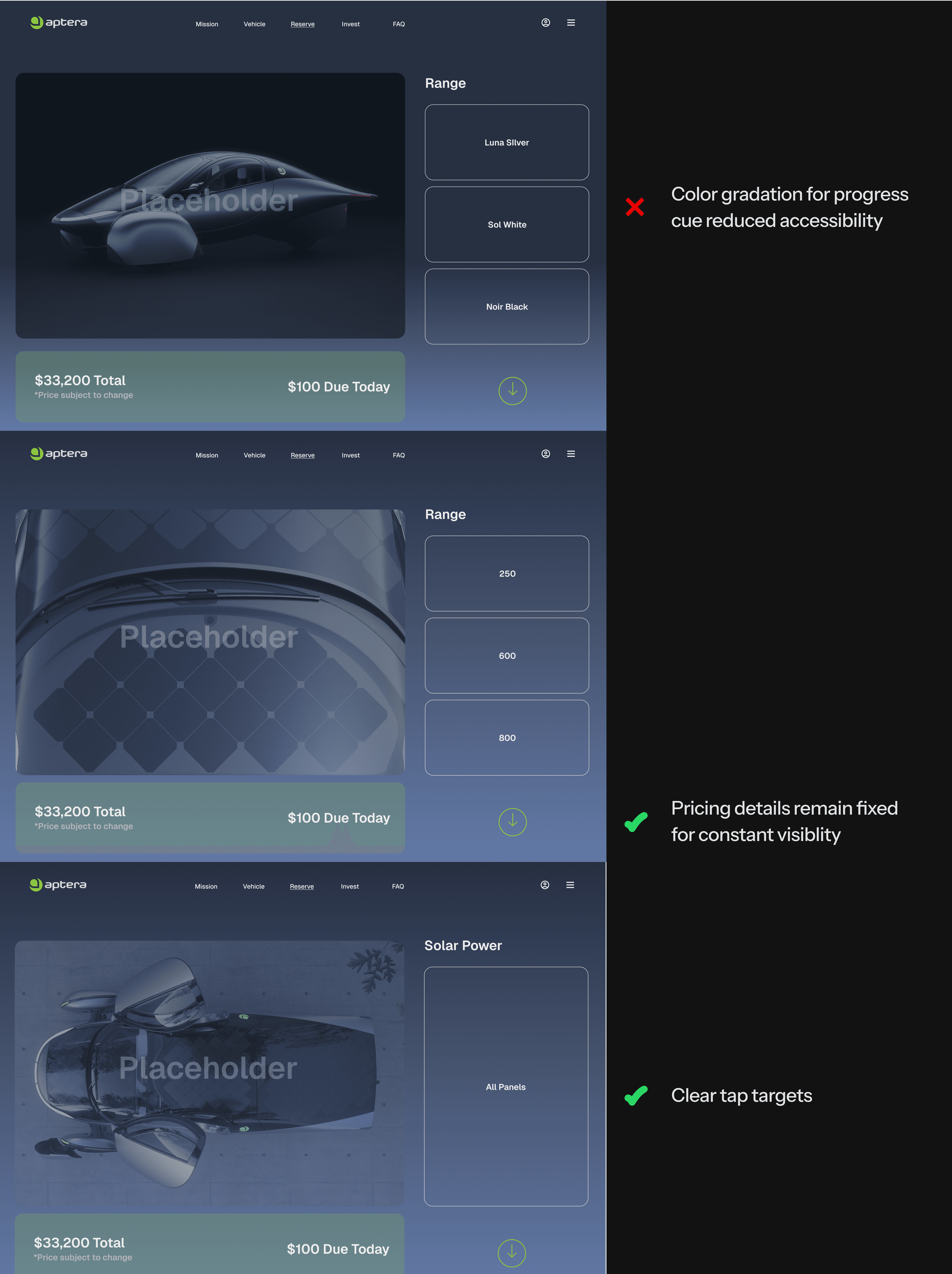 In our first ideation of the vehicle page, we used color gradation as a progress cue, shifting from dark to light to align with Aptera's solar brand. However, this approach fell short in accessibility and scalability.